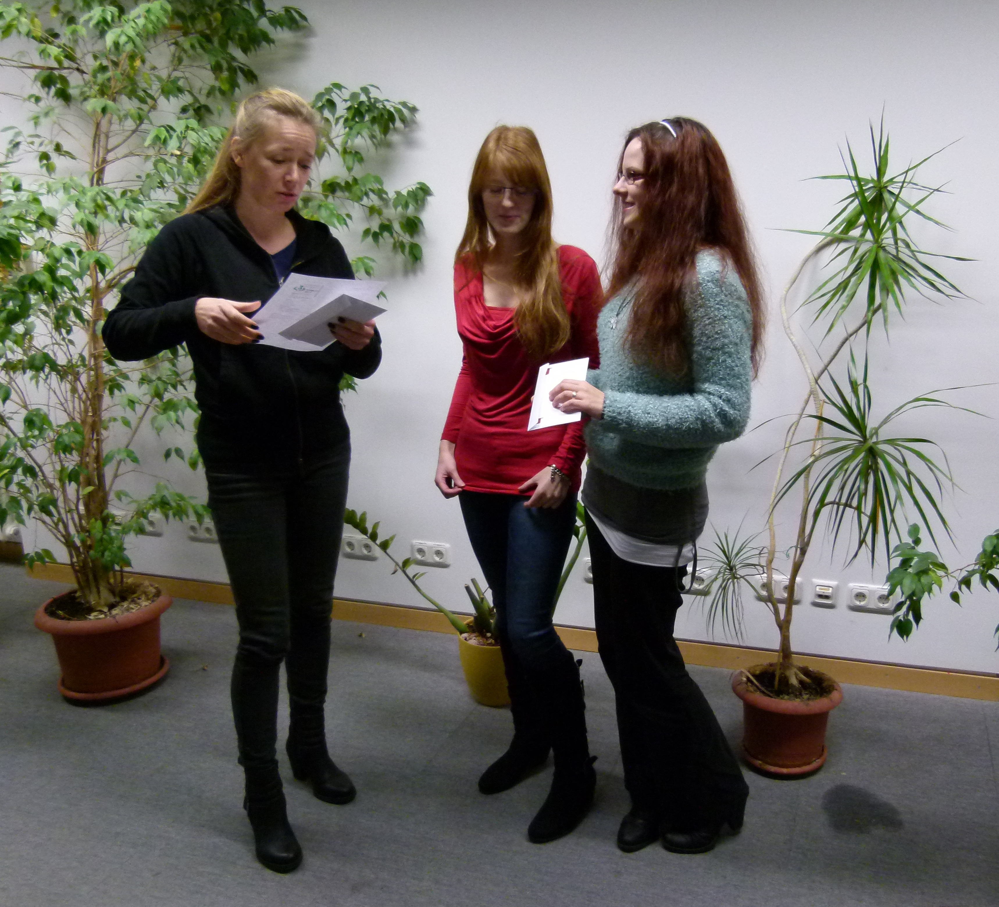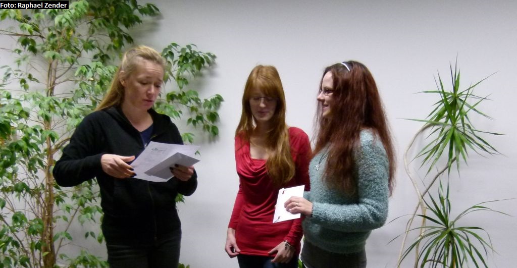 Foto: Übergabe der Preise an die Erstplatzierte (Christin Flehmke, rechts) und die Zweitplatzierte (Josephine Pötzsch, Mitte) durch Prof. Dr. Ulrike Lucke (links). (Foto: Raphael Zender)