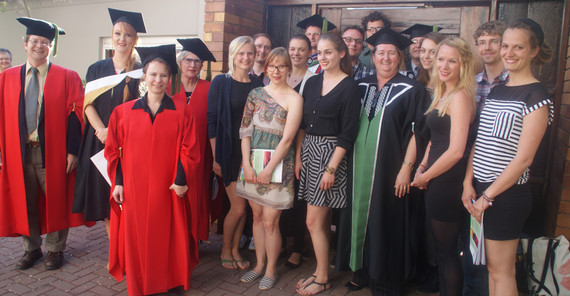 Auch die südafrikanische Nationalhymne vereint die Vielfalt Südafrikas und enthält Strophen in fünf verschiedenen Sprachen: Xhosa, Zulu, Sotho, Afrikaans und Englisch. Selbst Ansprachen werden in unterschiedlichen Sprachen gehalten. Wir erfahren später, dass nicht einmal die anwesenden Professoren jedes gesprochene Wort verstehen. Nach der offiziellen Zeremonie werden wir zu einem nahezu königlichen Abendessen eingeladen. Die Universität richtet für die frisch gebackenen Doktoren, Doktorinnen und deren Familien ein gemeinsames Essen aus, an dem auch wir teilnehmen dürfen. Wieder sind wir von der Feierlichkeit zutiefst beeindruckt. Die Lehrenden wie auch der Direktor der Universität halten engen Kontakt zu ihren Studierenden und Absolventen/innen. Da jeder Professor oder Professorin nur wenige Studierende unterrichtet, ist hier das Verhältnis der Studierenden zu den Unterrichtenden sehr vertraut. Oftmals unterstützen die ehemaligen Studierenden nach ihrem Abschluss die Universität finanziell. Wir unterhalten uns angeregt mit den Anwesenden der North-West University. Erneut werden wir internationalen Gäste sehr freundlich empfangen. Wir sind sehr glücklich über diese Zusammenarbeit und hoffen, dass es bald erneut zu solch einem gelungenen Austausch kommt. Und insgeheim wünschen wir uns alle, wir würden selbst so eine wunderschöne Abschlusszeremonie an unserer Universität erhalten.