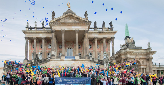 Zum Abschluss des akademischen Jahres 2015/16 lud die Universität Potsdam am 14. Juli 2016 um 14 Uhr zur feierlichen Verabschiedung ihrer Absolventinnen und Absolventen ein. Vor dem Triumphtor der Kolonnade am Neuen Palais wurden zahlreiche Gäste aus Politik, Kultur und Wirtschaft empfangen. Auch viele Freunde und Angehörige nutzten die Gelegenheit, den erfolgreichen Abschluss dieser wichtigen Lebensetappe gemeinsam mit den Absolventen zu feiern. Die Festrede hielt Timm Renner, Staatssekretär für Kulturelle Angelegenheiten beim Regierenden Bürgermeister von Berlin. Es musizierte die Akademische Bläserphilharmonie der Universität Potsdam unter der Leitung ihres Dirigenten, Hon.-Prof. Peter Vierneisel.
