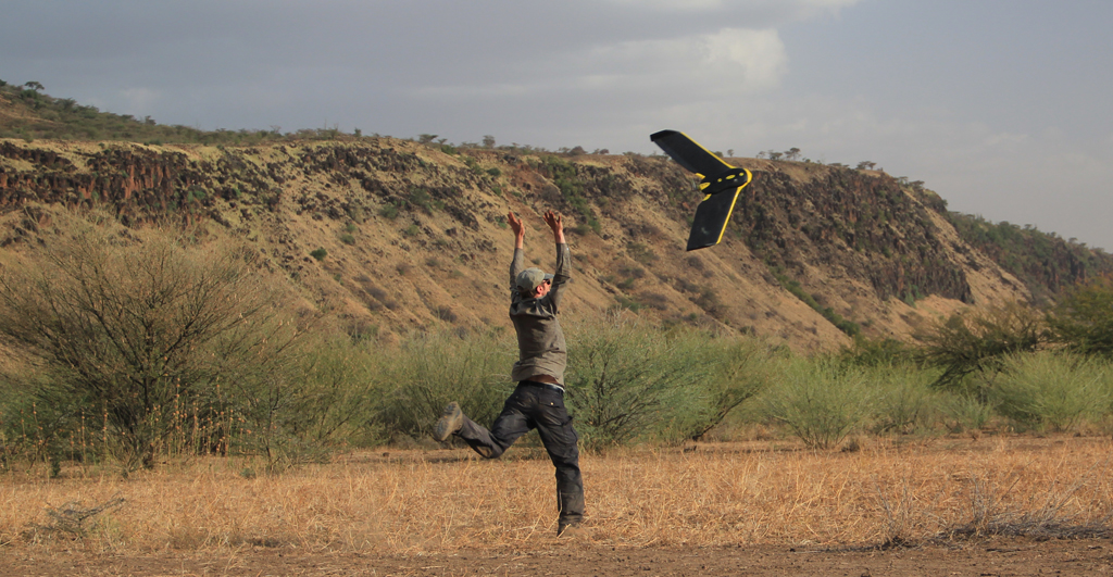 Foto: Starrflügeldrohne beim Start für einen Geländeeinsatz in der Nähe von Magadi (Süd-Kenia) in einem Graben des Keniarifts, Juli 2015. Foto: Simon Riedl.