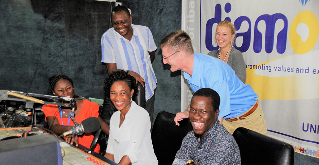 Zur gleichen Zeit ist der Rest der Gruppe zu Gast beim  Sender des Campus Radios Diamond FM. Wir werden zunächst von Emokhare Paul Anthony, dem Direktor des Senders, begrüßt, der uns dessen Produktionsweise erklärt. Der Sender ist nicht kommerziell und dient sowohl der Unterhaltung als auch der Bildung seiner Zuhörer. Anthony betont dabei, dass fast alle, die hier arbeiten, freiwillige Studierende oder Praktikanten aus verschiedenen Fachrichtungen seien. Die Qualität des Senders wird dadurch gesichert, dass es pro Einheit zugleich ausgebildete Mitarbeiter, wie z.B. Techniker, Redakteure und Ingenieure, gibt, welche die Produktion überwachen und den Studierenden beratend zur Seite stehen. Immerhin wird der Radiosender nicht nur auf dem Gelände der Universität gehört, sondern darüber hinaus im ganzen Bundesstaat.