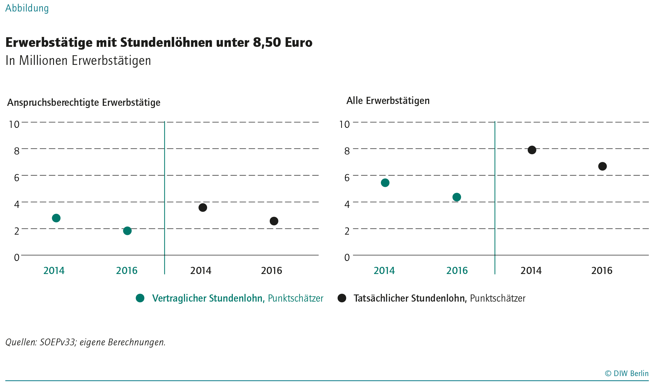 Basierend auf Angaben der Beschäftigten zu ihren monatlichen Gehältern und Arbeitsstunden im Rahmen der Langzeitstudie Sozio-oekonomisches Panel (SOEP) haben die StudienautorInnen ausgerechnet, dass im Jahr 2016 1,8 Millionen Personen, die anspruchsberechtigt waren, unter 8,50 Euro brutto pro Stunde verdienten, dem damaligen Niveau des Mindestlohns, wenn man ihre vertragliche Arbeitszeit zugrunde legt. Das sind eine Million weniger als im Jahr 2014, vor der Einführung des Mindestlohns, entspricht aber immer noch sieben Prozent aller anspruchsberechtigten ArbeitnehmerInnen. Diese Schätzung liegt deutlich über den Zahlen aus der amtlichen Statistik, die auf Angaben der Arbeitgeber basiert (rund 1,1 Millionen für das Jahr 2016).