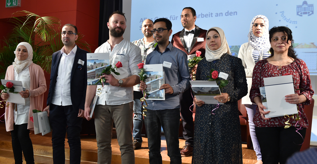 Vor zwei Jahren startete die Universität Potsdam ein einzigartiges Programm zur Qualifizierung geflüchteter Lehrkräfte für das deutsche Schulsystem, das bundesweit für Aufsehen sorgte. Nachdem im Herbst die ersten Absolventinnen und Absolventen in die Schulpraxis entlassen werden konnten, erhielten nun die Teilnehmenden des zweiten Durchgangs ihren Abschluss. Anlass für den Vizepräsidenten für Studium und Lehre, Prof. Dr. Andreas Musil, die Zertifikate feierlich zu überreichen. Zu den ersten Gratulanten gehörten die Wissenschaftsstaatssekretärin Dr. Ulrike Gutheil und Bildungsstaatssekretär Dr. Thomas Drescher.
