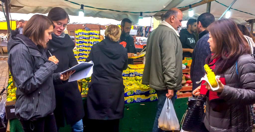 „Viele Touristinnen und Touristen sprechen andere Sprachen als die Community im Kiez“, sagt Freywald. Ein Kunde habe Zucchini für einen Euro gekauft und mit einem Fünfzig-Euro-Schein bezahlt, berichtet die studentische Mitarbeiterin İrem Duman. „Die 49 Euro gebe ich dir nächste Woche wieder“, hätte der Verkäufer daraufhin auf Deutsch gescherzt. Der Amerikaner habe diesen Witz allerdings nicht verstanden, er sprach kein Deutsch. Um solche Situationen zu erfassen, führen die Projektbeteiligten anschließend Mini-Interviews. Sie befragen die Menschen auf dem Markt zu ihren Sprachkenntnissen und ihrer sprachlichen Biografie. Eine Mitarbeiterin bleibt als „stille Beobachterin“ am Stand: Sie notiert Gesprächssituationen und Atmosphären, ohne selbst zu interagieren. Diese ethnografische Feldforschung wird anschließend durch grammatische Analysen ergänzt.