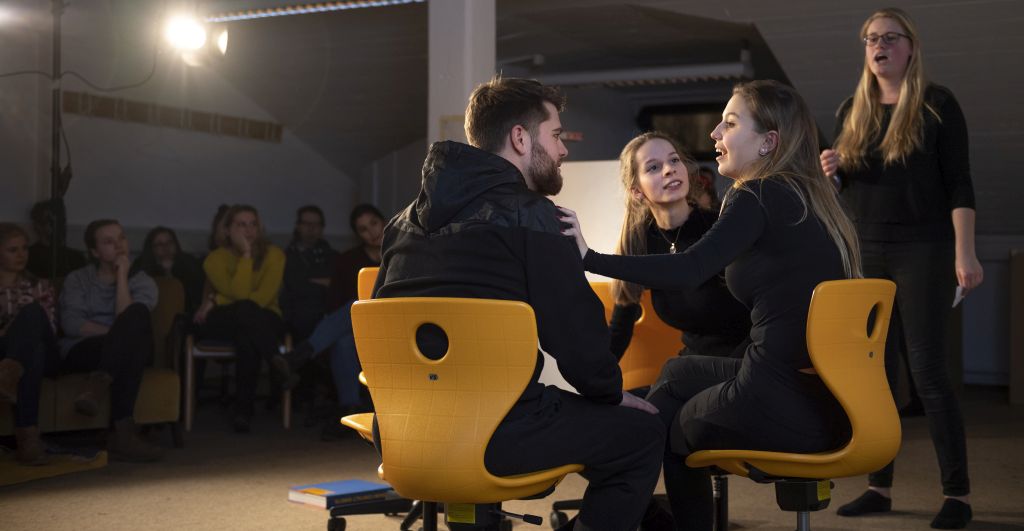 Ein kleiner Seminarraum dient als Probebühne. Seine Dachschrägen sorgen für Wohlfühl-Atmosphäre. Gleich rechts von der Tür befindet sich ein Scheinwerfer, der helles Licht wirft, unmittelbar dahinter die kleine Musikanlage. Alles wirkt etwas provisorisch, auch die zwei Zuschauerreihen, zu denen ein kleines Sofa gehört. Endlich zieht Ruhe ein. Das Spiel beginnt.