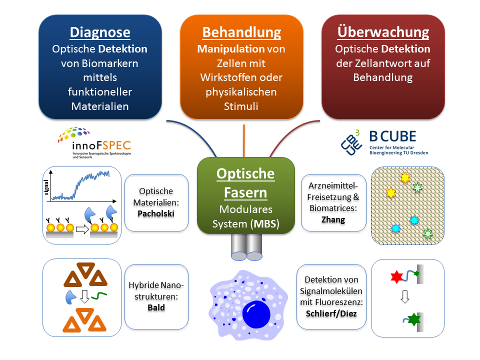 Die beiden Projektpartner ergänzen sich dabei hervorragend hinsichtlich ihrer Kompetenzen. Erst durch das interdisziplinäre Team bestehend aus Dr. Claudia Pacholski (Funktionelle Nanomaterialien), Prof. Ilko Bald (Hybride Nanostrukturen), Prof. Yixin Zhang (Biomolekulare Interaktionen), Prof. Stefan Diez (BioNanoWerkzeuge) und Prof. Michael Schlierf (Molekulare Biophysik) können die therapeutischen Werkzeuge entwickelt werden. Das innoFSPEC kann Erfahrungen in der Entwicklung faseroptischer Methoden aufweisen und das B CUBE bringt die Expertise in Fluoreszenztechnologien und Biomaterialien mit. Gemeinsam können sie sich den Herausforderungen der optischen Zelldiagnose stellen und der personalisierten Medizin konkrete Perspektiven aufzeigen.