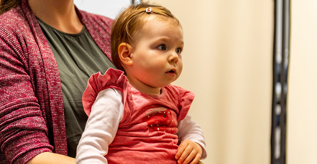 Sind alle bereit? Im Experimentraum stehen Stühlchen, Tisch und Monitor schon bereit. Mathilde nimmt auf dem Schoß ihrer Mama Platz. Zur FFP2-Maske setzt die Mutter noch eine Brille mit abgeklebten Gläsern auf, damit sie nichts sieht und Mathilde nicht beeinflussen kann. Tom Fritzsche verschwindet hinter einem Paravent an seinen Computer. Von dort aus überwacht er das Experiment. Dank einer zusätzlichen Videoaufzeichnung können die Daten auch im Nachhinein noch überprüft werden. Bevor der erste Ton eingespielt wird, ist die Kleine fasziniert von Mamas neuem Accessoire, das nun zusätzlich zu Mund und Nase auch die Augen verdeckt. Aber sobald die ersten Laute zu hören sind, verfolgt Mathilde aufmerksam den Bildschirm und lauscht. Der erste Teil des Experiments beginnt.