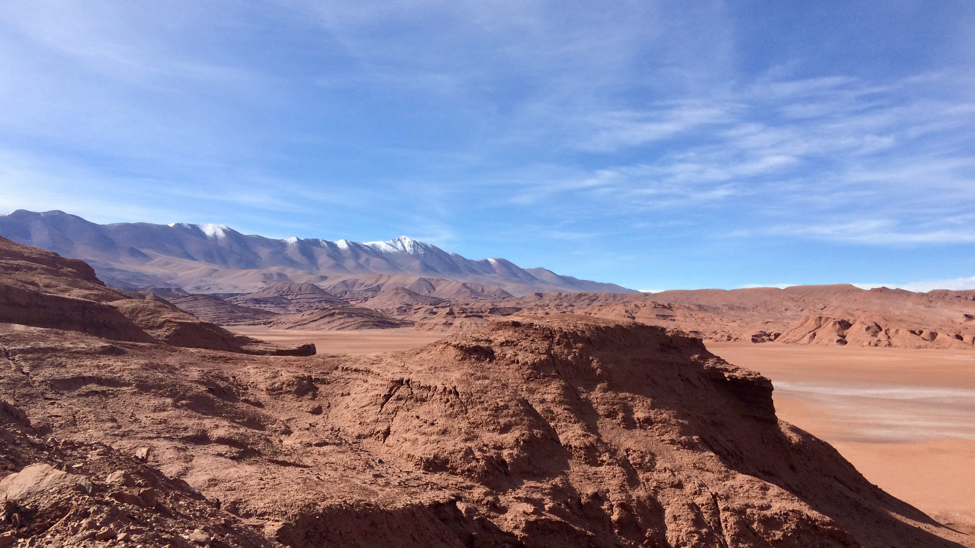 Abbildung 1: Deformierte miozäne Redbeds vor der Sierra Macón, Pocitos-Becken, Puna-Plateau, NW-Argentinien. Bildrechte: Heiko Pingel.
