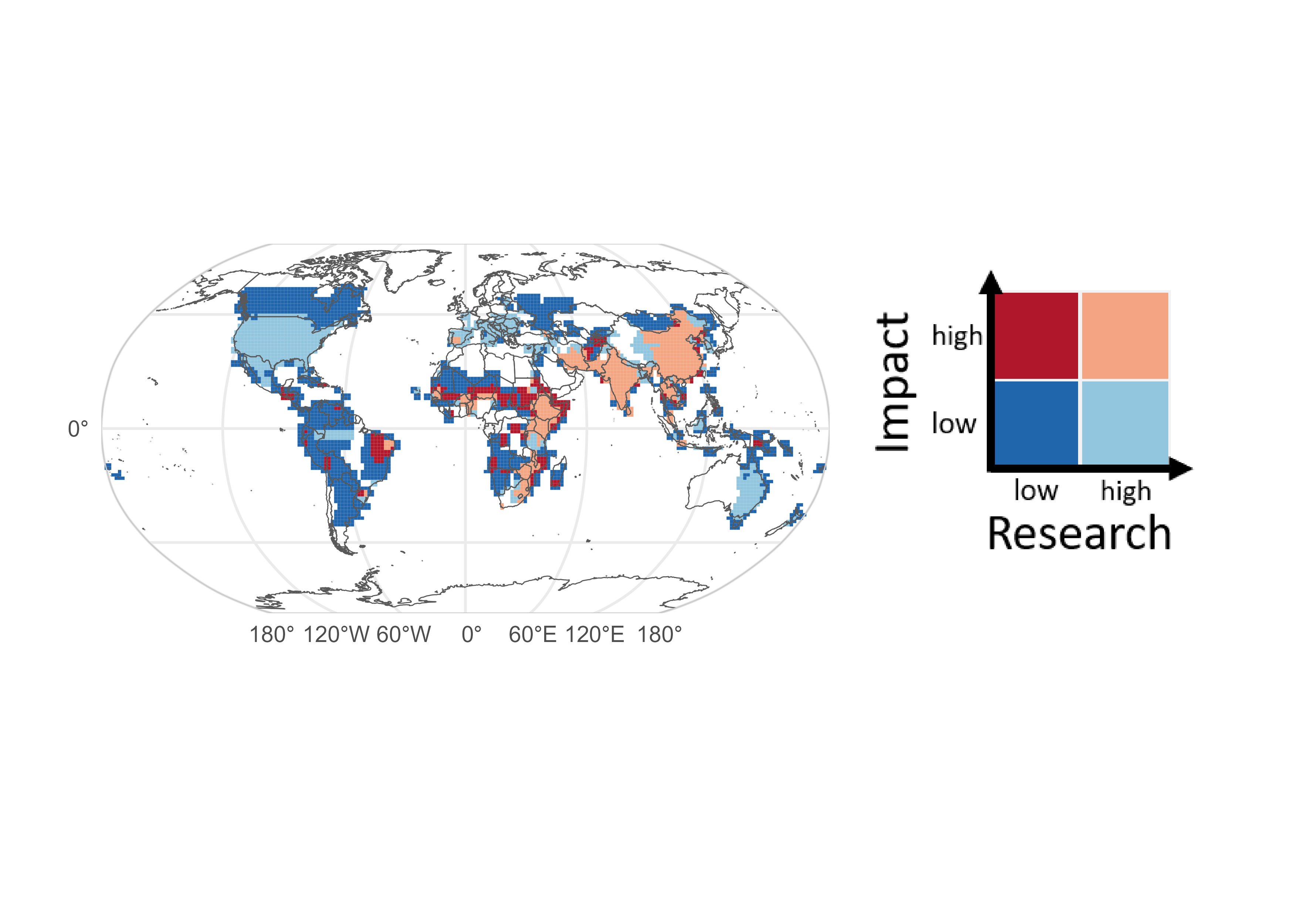 Abbildung 2: Globale Karte der Forschungsaktivitäten (Research) in Relation zum Auftreten (Impact) von Dürren. Bildrechte: Lina Stein.