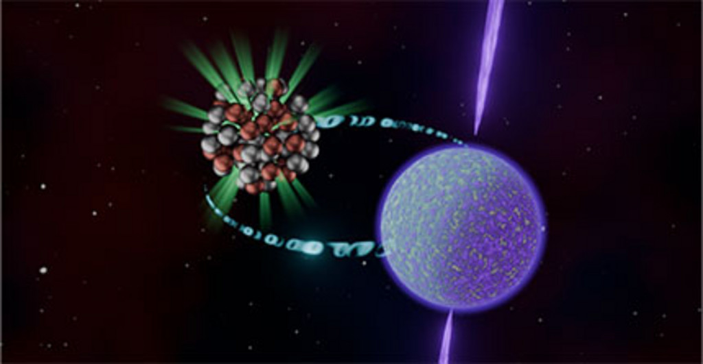 Abbildung: Künstlerische Darstellung eines Neutronensterns und eines Atomkerns. Symbolisiert wird, wie Erkenntnisse über Neutronensterne Fragen aus der Kernphysik beantworten können und umgekehrt. Bild: Hauke Köhn.