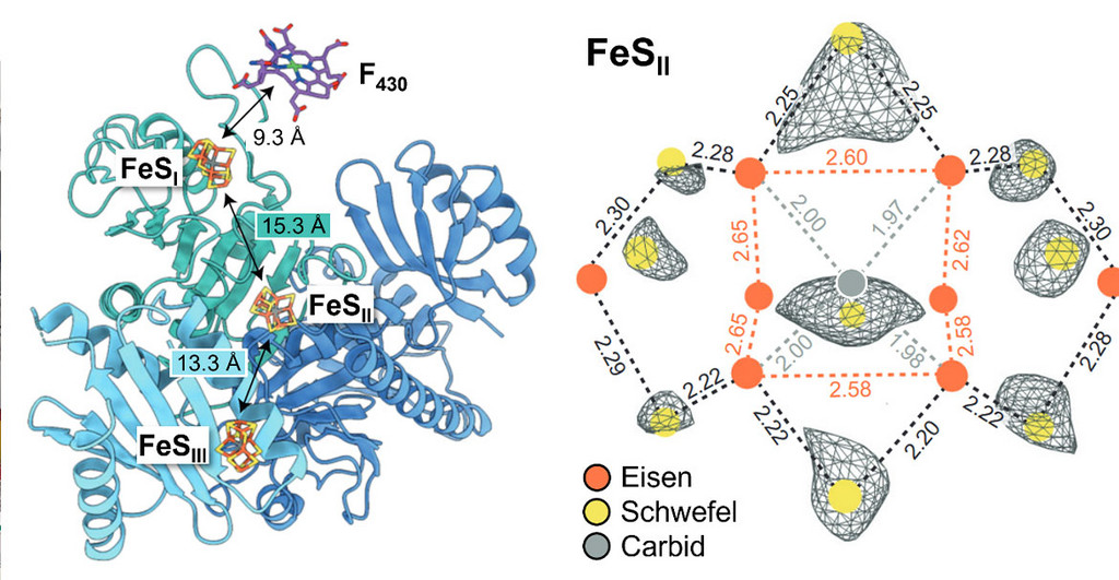 Abbildung 2: Elektronenmikroskopie-Struktur vom MCR-Aktivierungskomplex mit drei neuartigen Eisen-Schwefel-Cofaktoren (FeS). Bild: Sven T. Stripp