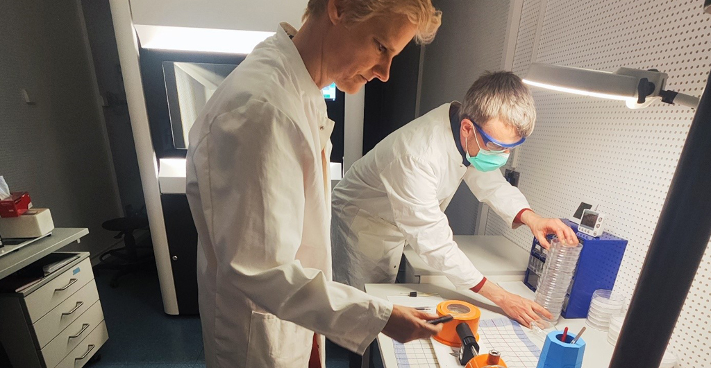 Abbildung 1: Prof. Petra Wendler und Dr. Jakob Ruickoldt bei der Vorbereitung des Probenhalters für die Kryo-Elektronenmikroskopie. Foto: Sophie Reisdorf