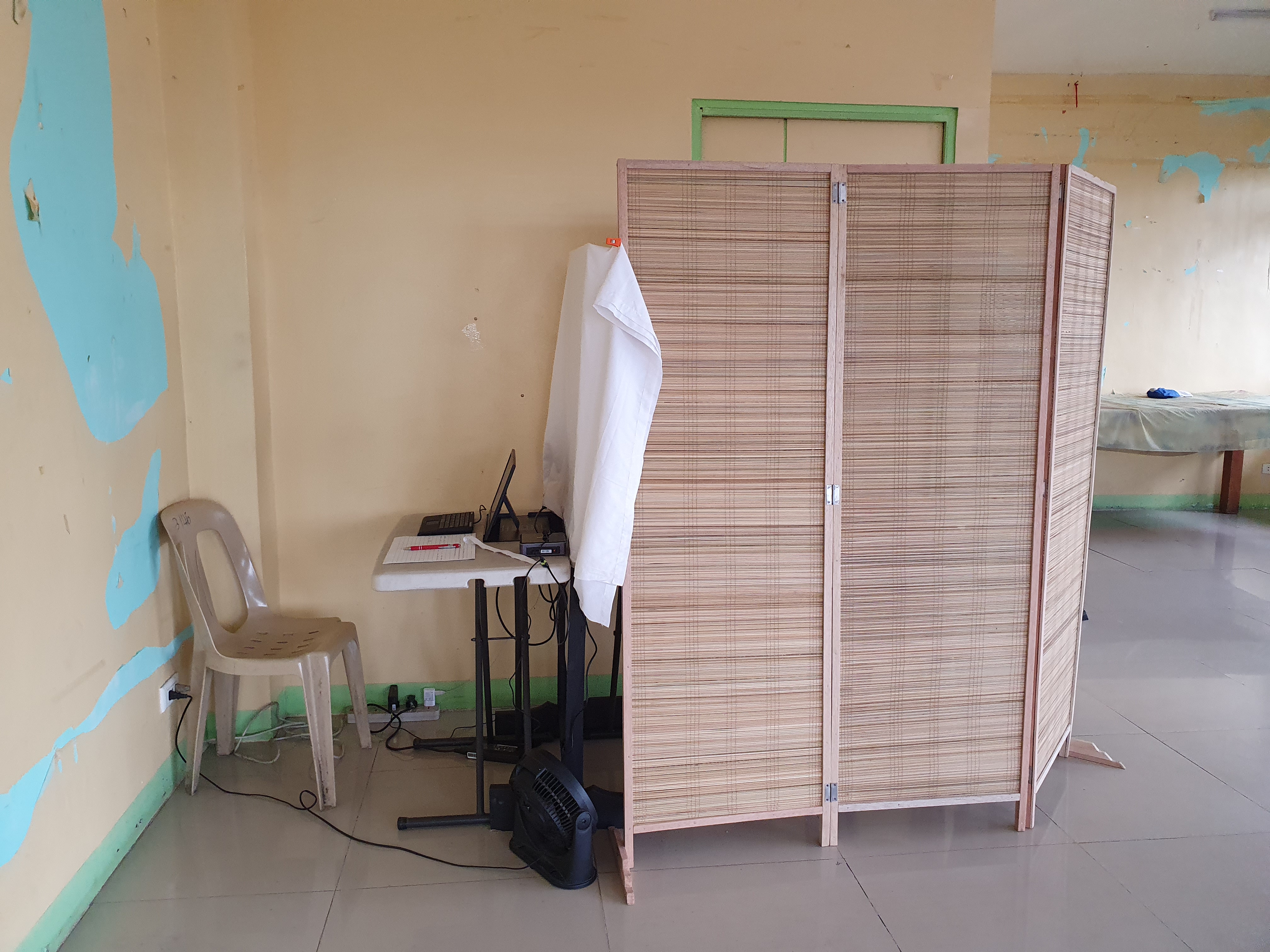 2025_080_Foto 2_Rowena Garcia.jpg: Das mobile Babylab im Gemeindesaal der Nachbarschaft. Der verdeckte Teil ist der Bereich, in dem die Teilnehmer sitzen, wobei das Baby auf dem Schoß der Betreuungsperson sitzt. Foto: Dr. Rowena Garcia