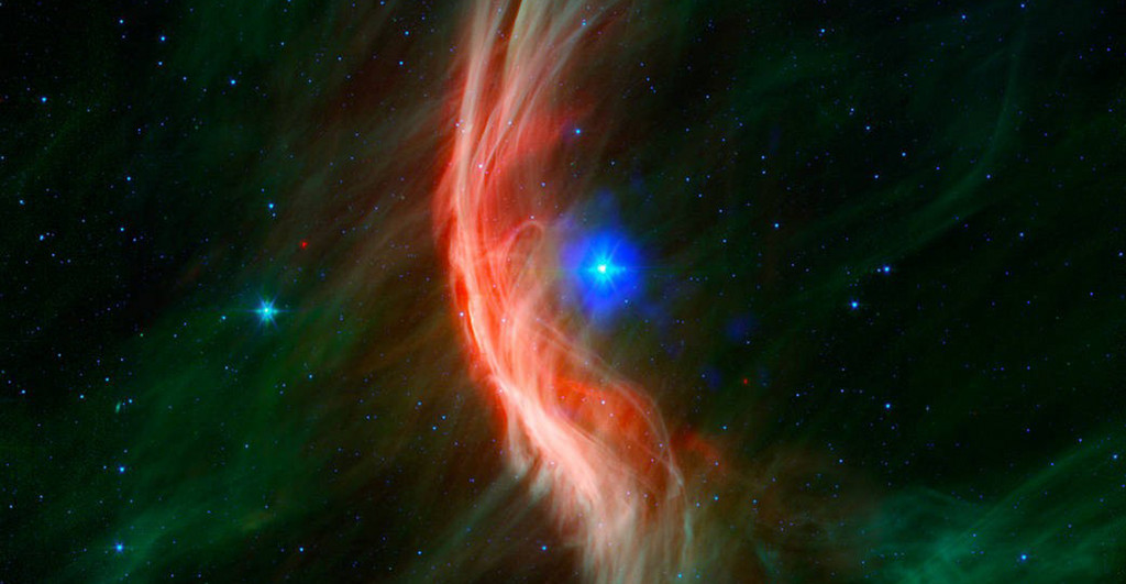 Abbildung: 2025_084_zetaoph_nasa: Der massereiche Stern Zeta Ophiuchi, hier in einem Infrarotbild des Spitzer-Instruments, bewegt sich mit einer Geschwindigkeit von 24 km/s. Solche Objekte beeinflussen die Verteilung von Supernova-Überresten in der Galaxis. Bild: X-ray: NASA/CXC/Dublin Inst. Advanced Studies/S. Green et al.; Infrared: NASA/JPL/Spitzer