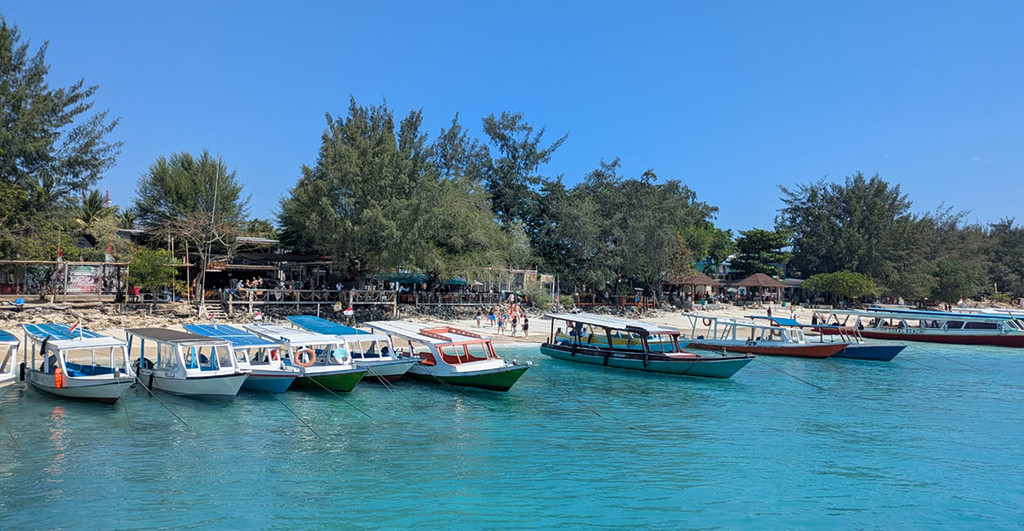 Unser vorletzter Tag vor der Abreise am Freitag beginnt früh. Um 6:15 Uhr werden wir vom Hotel abgeholt und machen uns auf den Weg zum Hafen Padang Bai im Süden Balis. Von dort aus kann man die drei Gili-Inseln und die Insel Lombok erreichen. Wir steigen auf Gili Trawangan aus und machen uns auf den Weg zu einem Strand, wo es Schildkröten geben soll. Nachdem wir schon letzte Woche mehr über Schildkröten erfahren konnten, ist dies nochmal eine Möglichkeit, sie unter Wasser zu erleben. Auf dem Weg dorthin staunen wir über das Blau des Wassers, das Weiß des Strandes und über die Ruhe. Gili Trawangan ist eine autofreie Insel, doch auch die sonst überall zu findenden Roller „schweigen“ hier. Die Roller sind dort alle elektrisch, man kann aber ein Fahrrad ausleihen oder die Insel auf einer traditionellen Pferdekutsche erkunden.