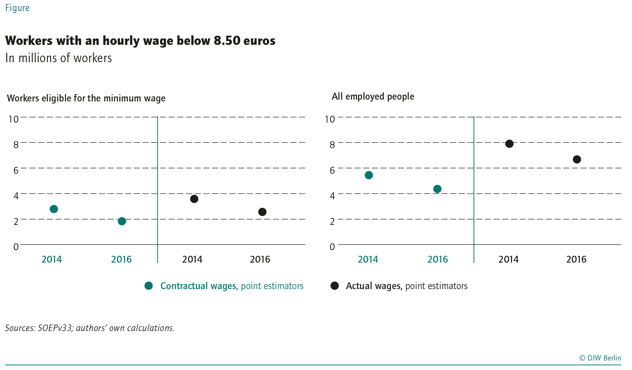 Based on information provided by workers about their monthly wages and work hours within the long-term study Socio-Economic Panel (SOEP), the authors of this study calculated that in 2016, 1.8 million people who were eligible for the minimum wage were actually earning less than 8.50 euros gross per hour –the minimum wage at the time – based on their contractual work hours. This figure has dropped by a million since 2014, before the minimum wage was introduced, but is still equivalent to seven percent of all eligible employees. This estimate is significantly higher than the official numbers which are based on information from employers (approximately 1.1 million in 2016).