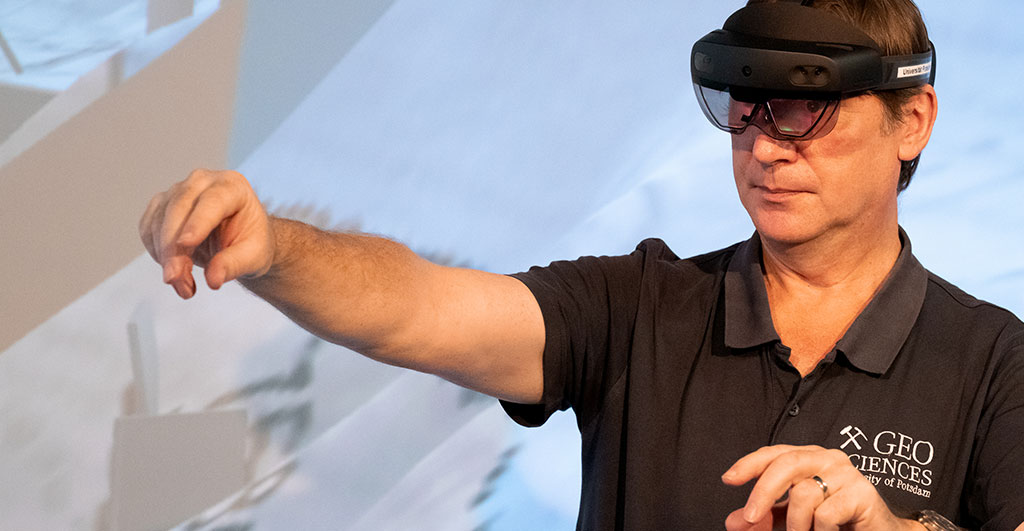 His project, “Visualizing Landscape Changes Using AR in Real Environments,” received a FöWiTec award in 2021, with which the University of Potsdam financially supports knowledge and technology transfer. The idea for the project grew out of the 3D laboratory that Zeilinger has headed at the Institute of Geosciences since 2011. In this lab, multidimensional data sets are projected spatially to visually analyze data structures as well as their internal relationships. Unlike with virtual reality (VR) headsets, in the 3D lab you aren’t looking at a pure computer image; you’re working together immersively on the object. This means that a 3D headset enables you to see digital objects floating in space. “This is a great advantage in terms of communication, as the participants in a group can see each other,” says Zeilinger. “This experience from the 3D lab – that the discussion track simply has to be open and you can capture the facial expressions and gestures of the others – is something we also want to implement with AR glasses.”