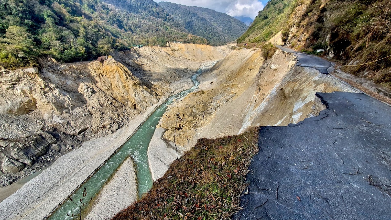 Image 1: A path of devastation along the Teesta River. The flood undercut the slopes in many places, triggering landslides. Credit: Praful Rao.