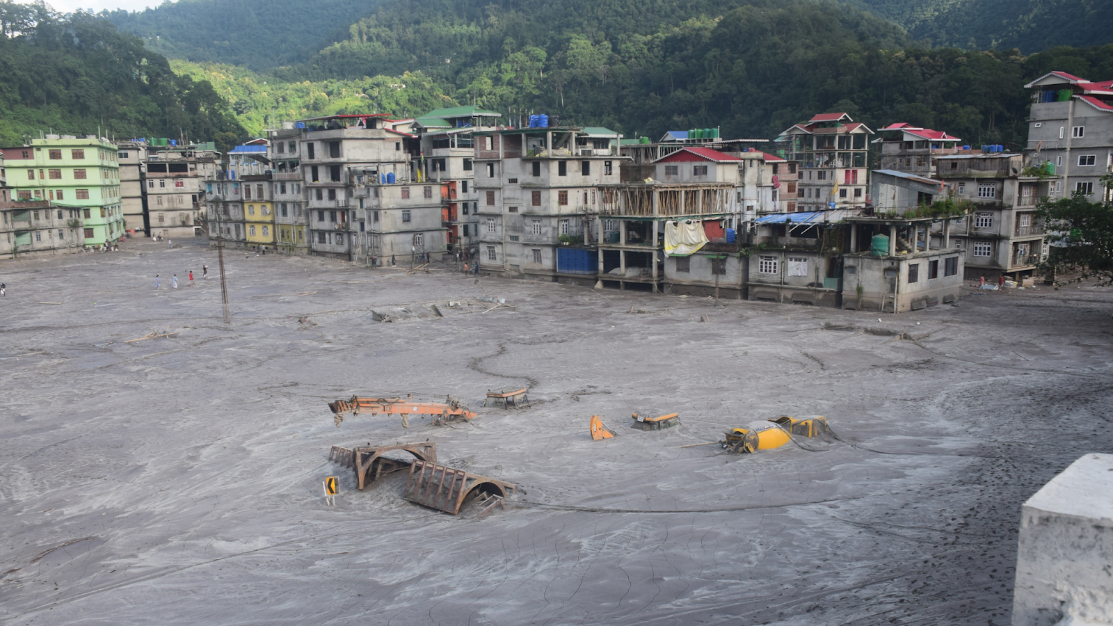 Image 2: Buildings and cars in the town of Rangpo were buried under the sediment masses of the flood. Credit: Praful Rao.