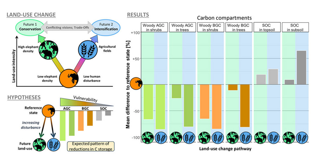There are conflicting ideas about the development of rural Africa: On the one hand, governments and conservation organizations want to protect savanna ecosystems in order to preserve the habitat and migration areas of wildlife such as elephants and lions. On the other hand, the local population's food supply is based on farming, meaning that their future livelihood can only be secured through expanding or intensifying agriculture – also as a result of climate change. As drylands are the largest terrestrial carbon sink, these visions of the future have a significant impact on global carbon storage. “However, the storage potential of savannas has not yet been sufficiently researched and their carbon dynamics with regard to disturbance factors such as browsing by elephants, woodcutting and livestock herding are poorly understood,” says leading author Dr. Liana Kindermann.