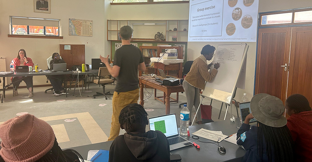In the next session, Dr. Gunnar Dressler introduces us to modelling social-ecological systems. As an opening task, he challenges us to develop a model in our had in order to estimate how many of his water bottles could fit into our lecture room. While we never settle on a final answer, we learn about various types of models and their applications. We discuss in particular agent-based models, and work in small groups to identify elements and processes for developing a rangeland management model.